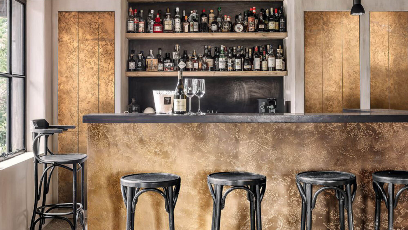 レストランやバー、ホテル、住宅などの壁⾯や家具など、あらゆる空間において仕上げを⾦属質に変え、わずか数ミリの塗り厚で豊かな質感と⾦属特有の光沢感を演出することができます。